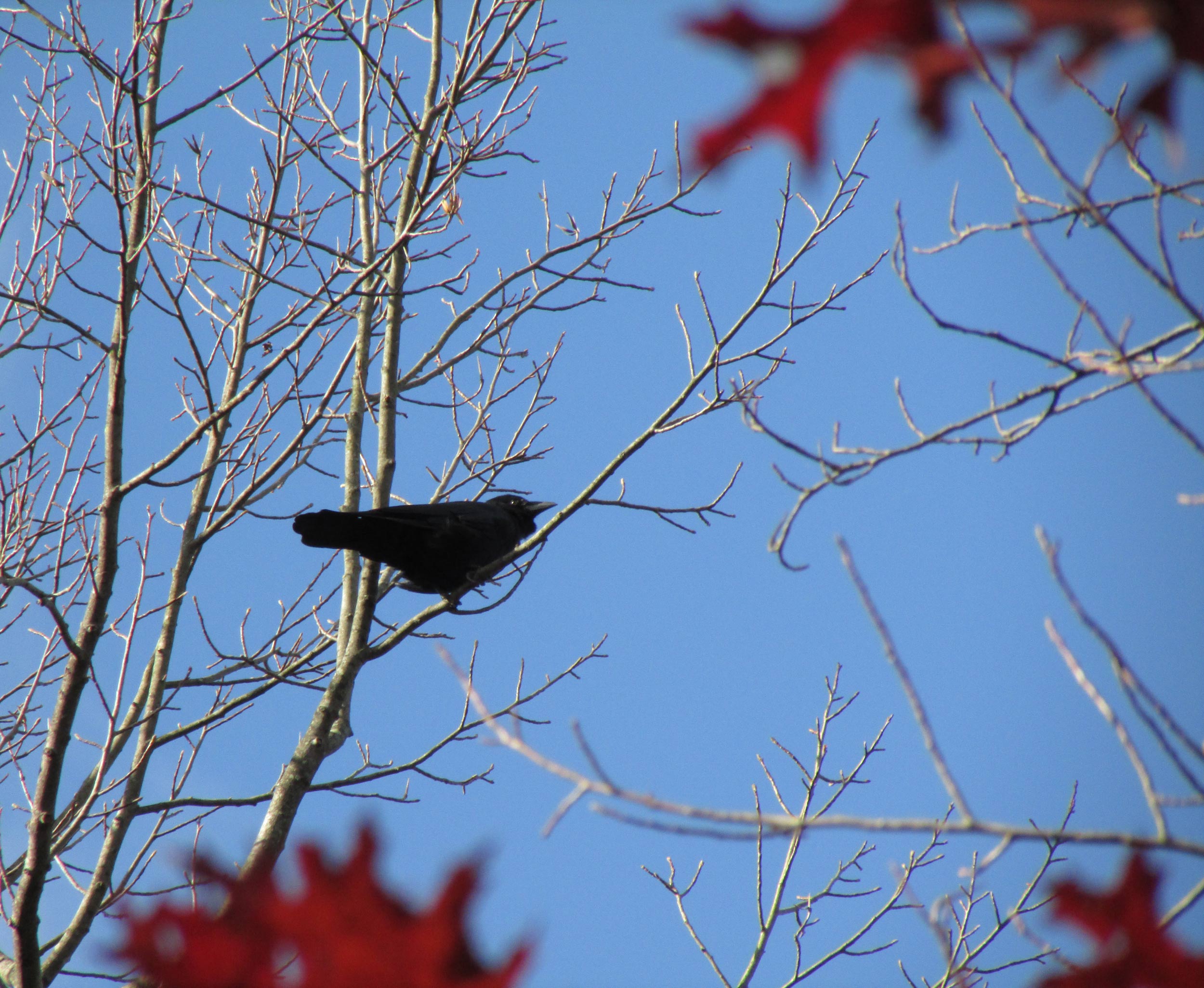 Black bird on a branch   A fall seasonal picture.black bird is perched on a small branch in this free stock photo. Red, out of focus oak leaves can be seen flanking the main subject.