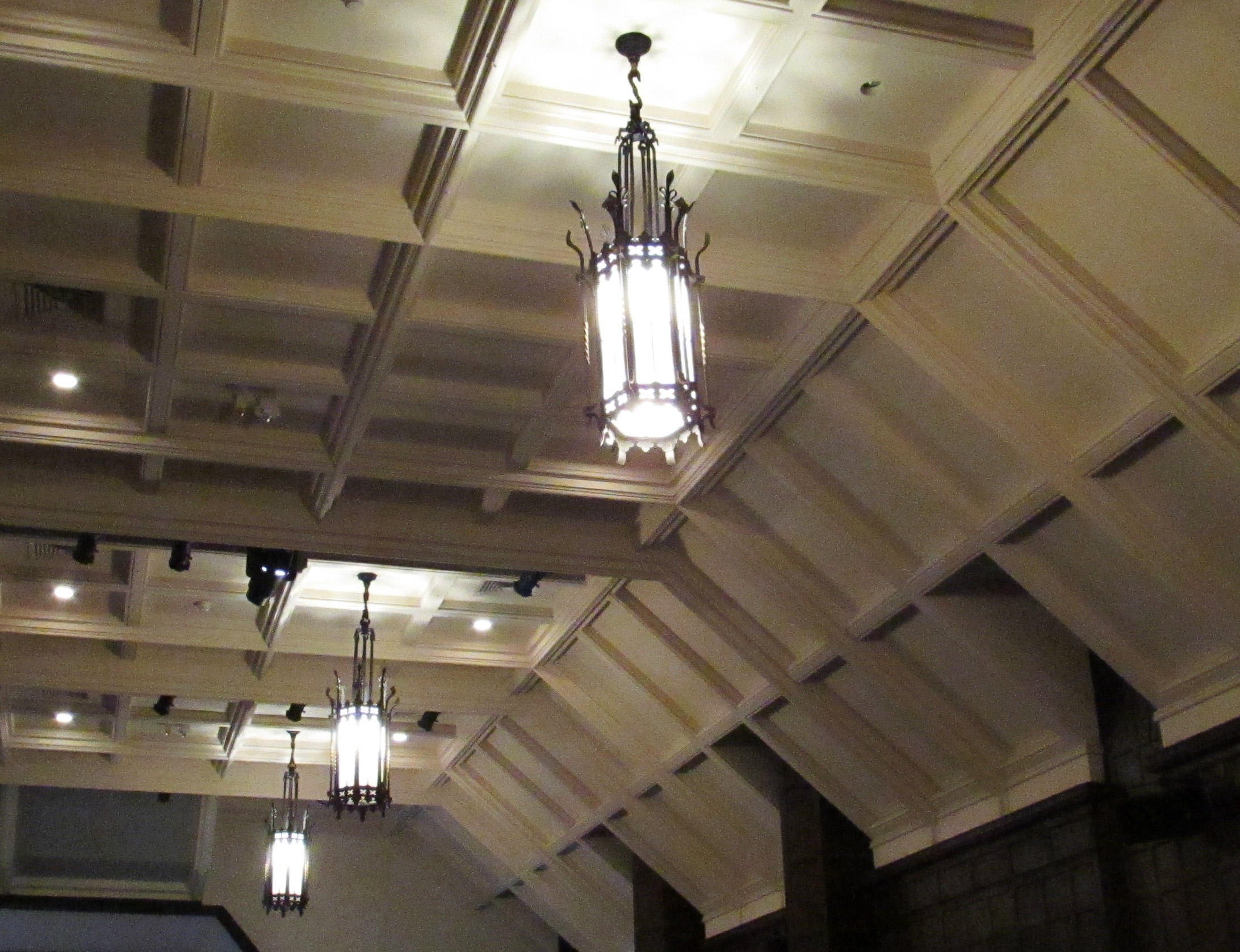 Looking across a large room with a decorated ceiling and cast iron lights hanging from the ceiling.