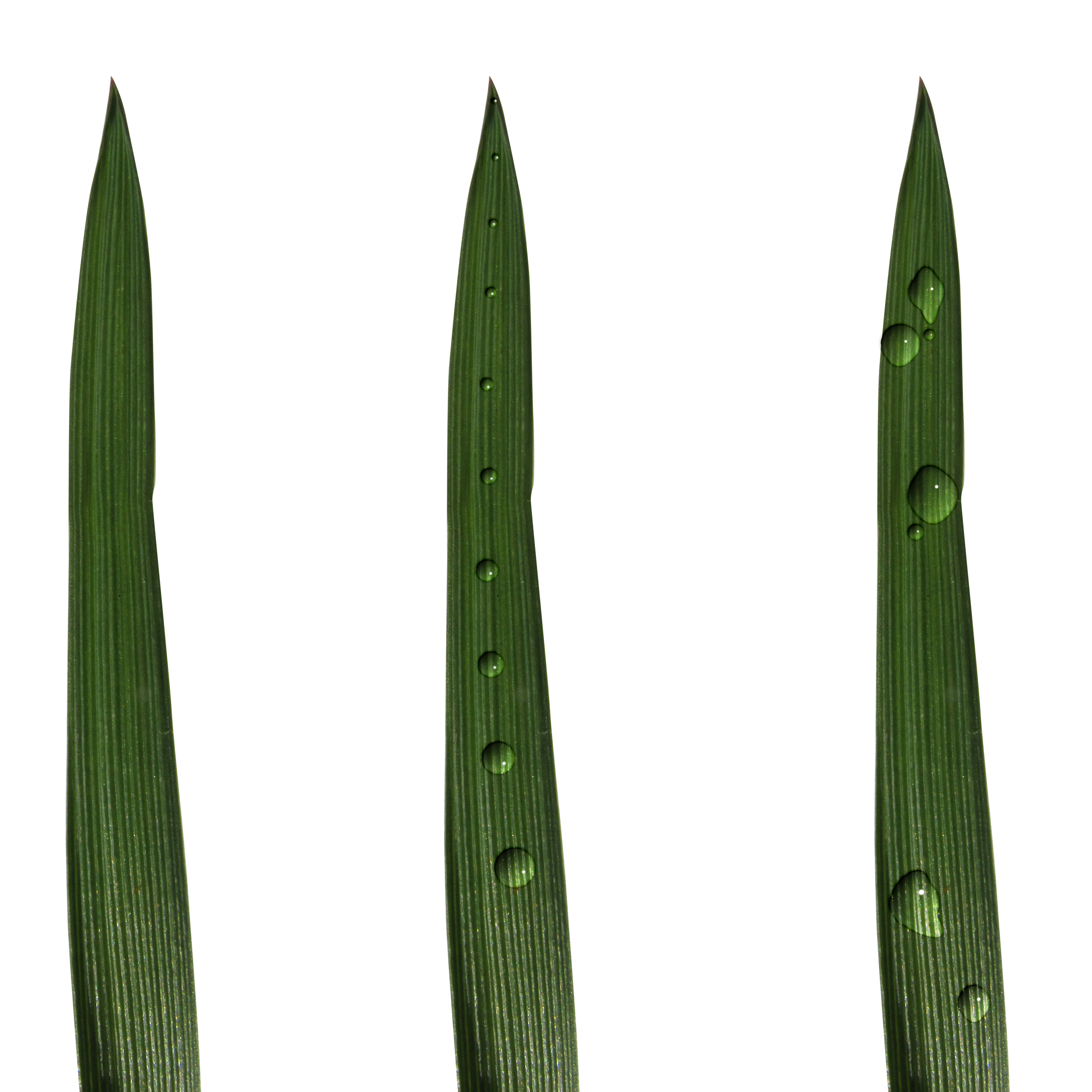 Three grass blades, two of which have various water droplet effects applied to them.