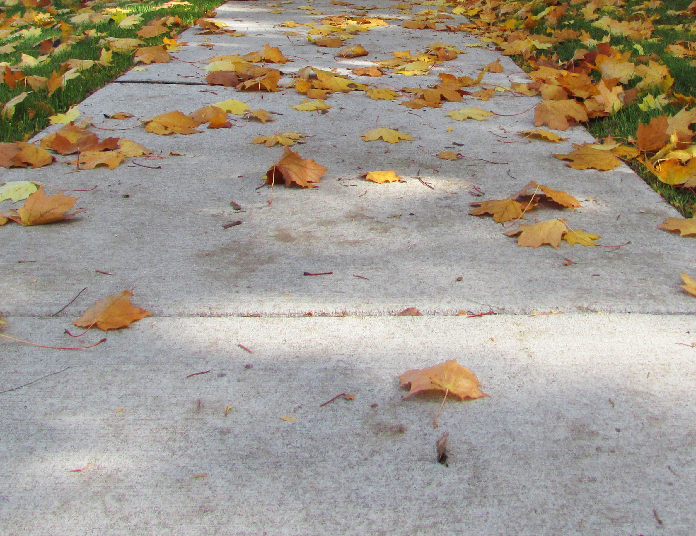 A fall seasonal picture showing fallen leaves over a sidewalk during a walk to work on afternoon.