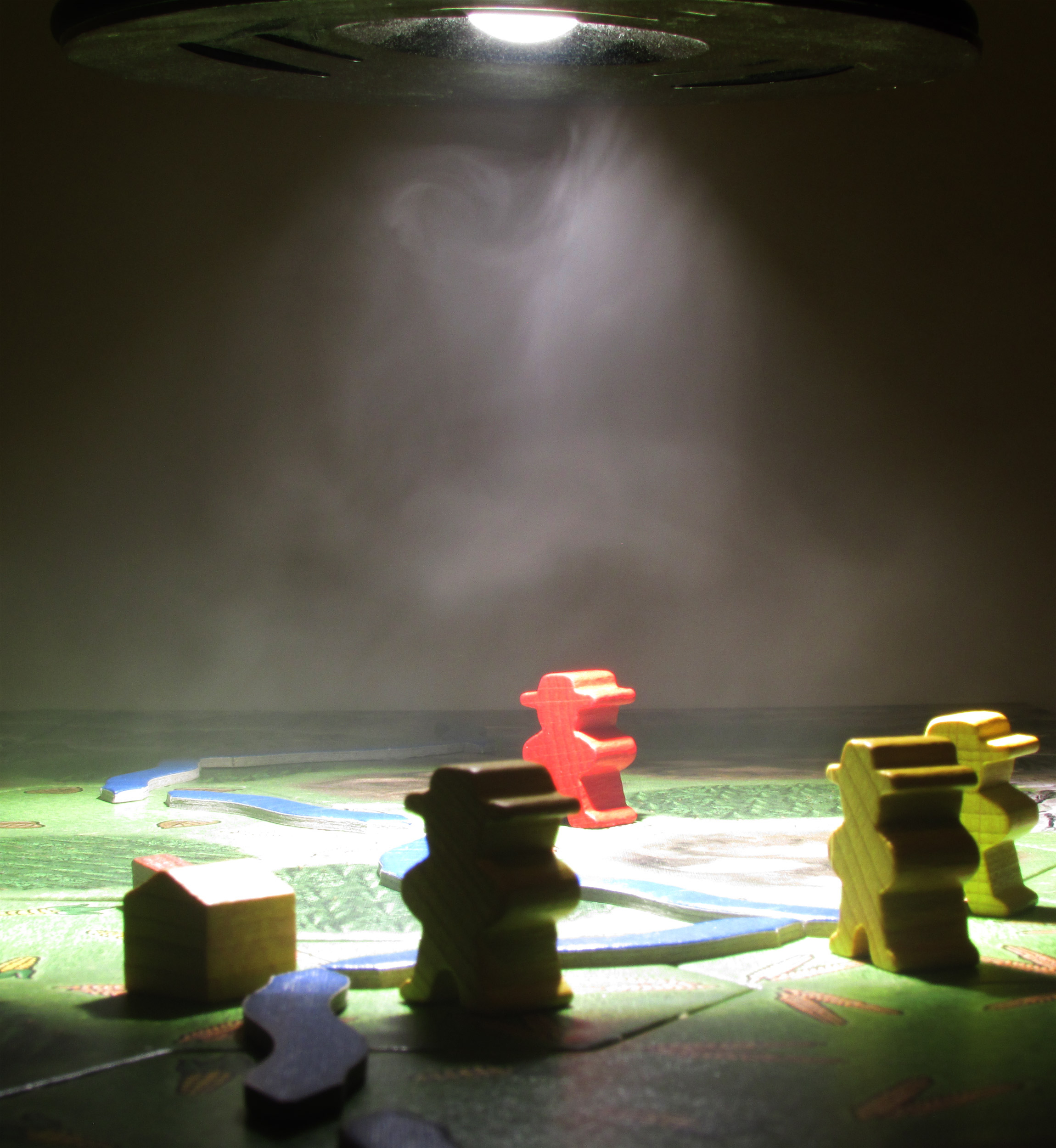 The photo challenge entry picture that was submitted for artificial light. This image shows game pieces set out on the board with a desk lamp centered on top in the shot and smoke blown into the scene.