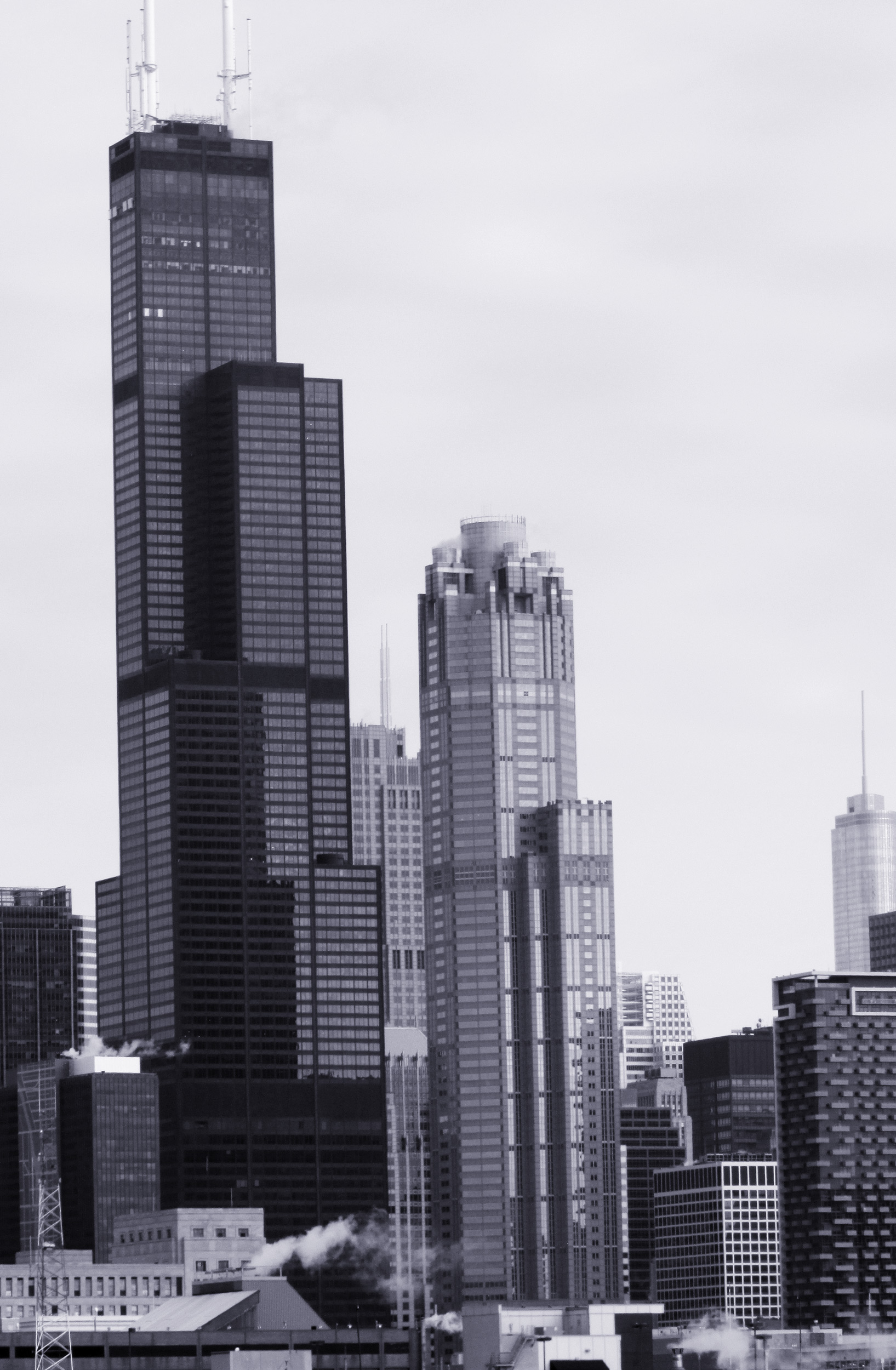 black buildings cars chicago city drive signs skyscrapers transportation travel white work