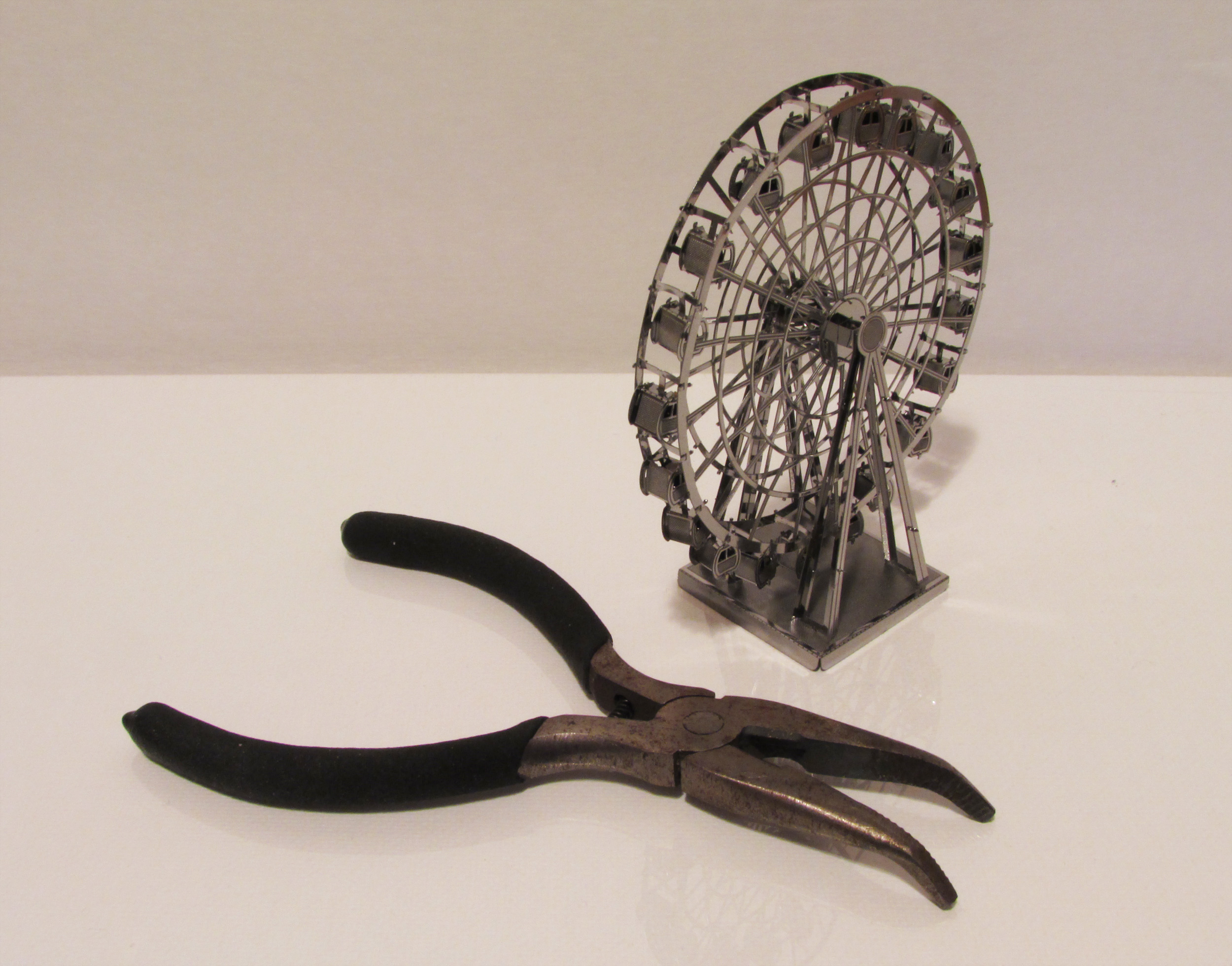 A picture looking down to a set of pliers and a metal ferris wheel model on a white surface with a white background.