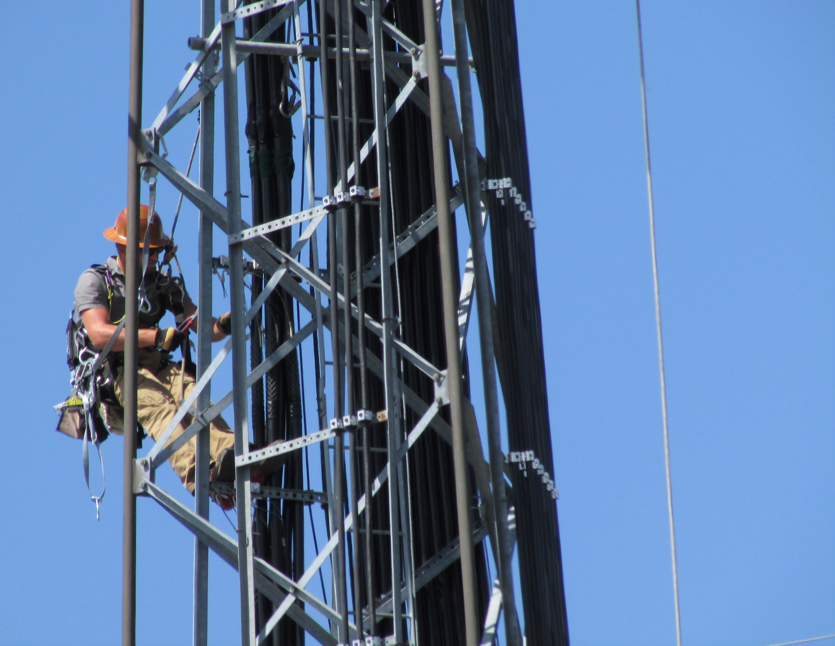cell phone tower repair worker   Picture of a cell tower worked climbing down after making reapirs to the tower.