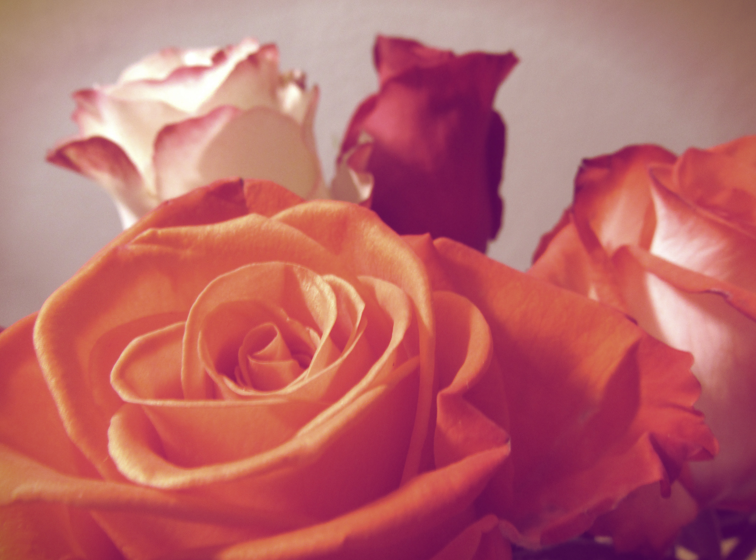 A close up of a bouquet of roses with a color filter added. Give a vintage effect.