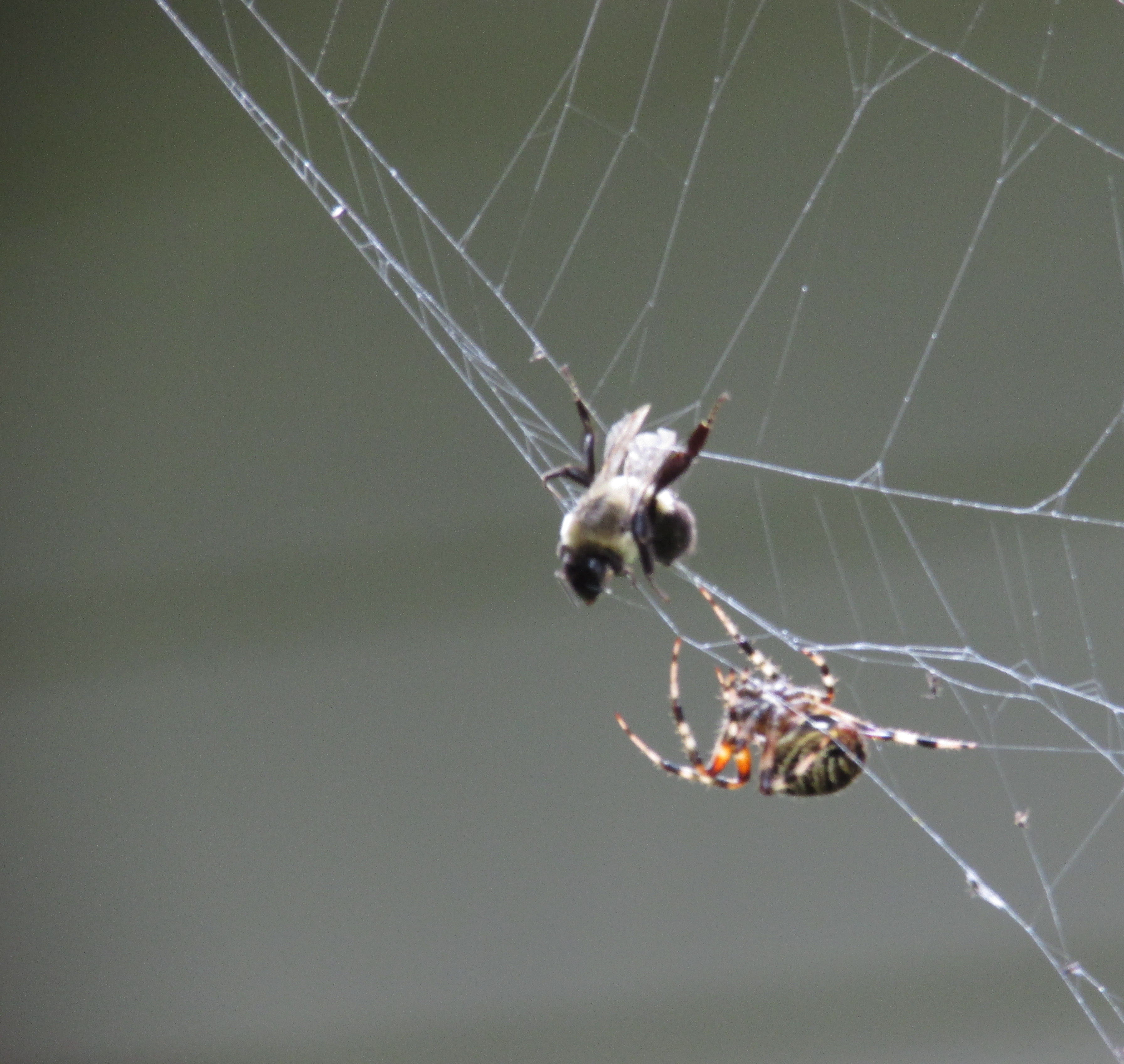 Picture of a two spotted spider with a large bumble bee trapped in it's web. I continued to watch the pair expecting the spider to bite the bumble bee, though he [the bumble bee] was able to escape with some vigorous shaking. He freed himself leaving the spider to try another day.