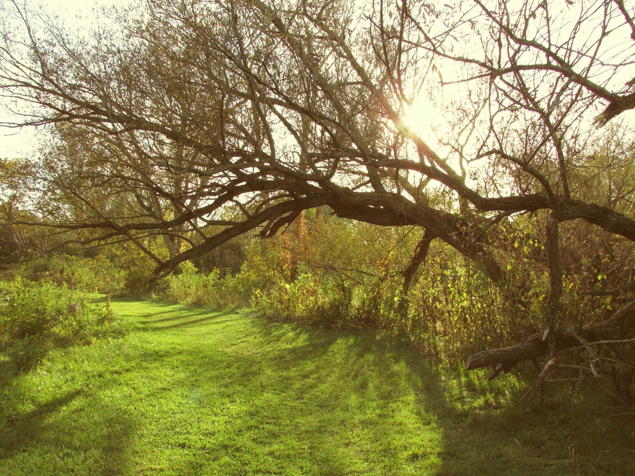 A bent tree hangs over the bend of a grassy path in this picture. The image was taken in early fall and the color scheme has been slightly modified to amplify that.