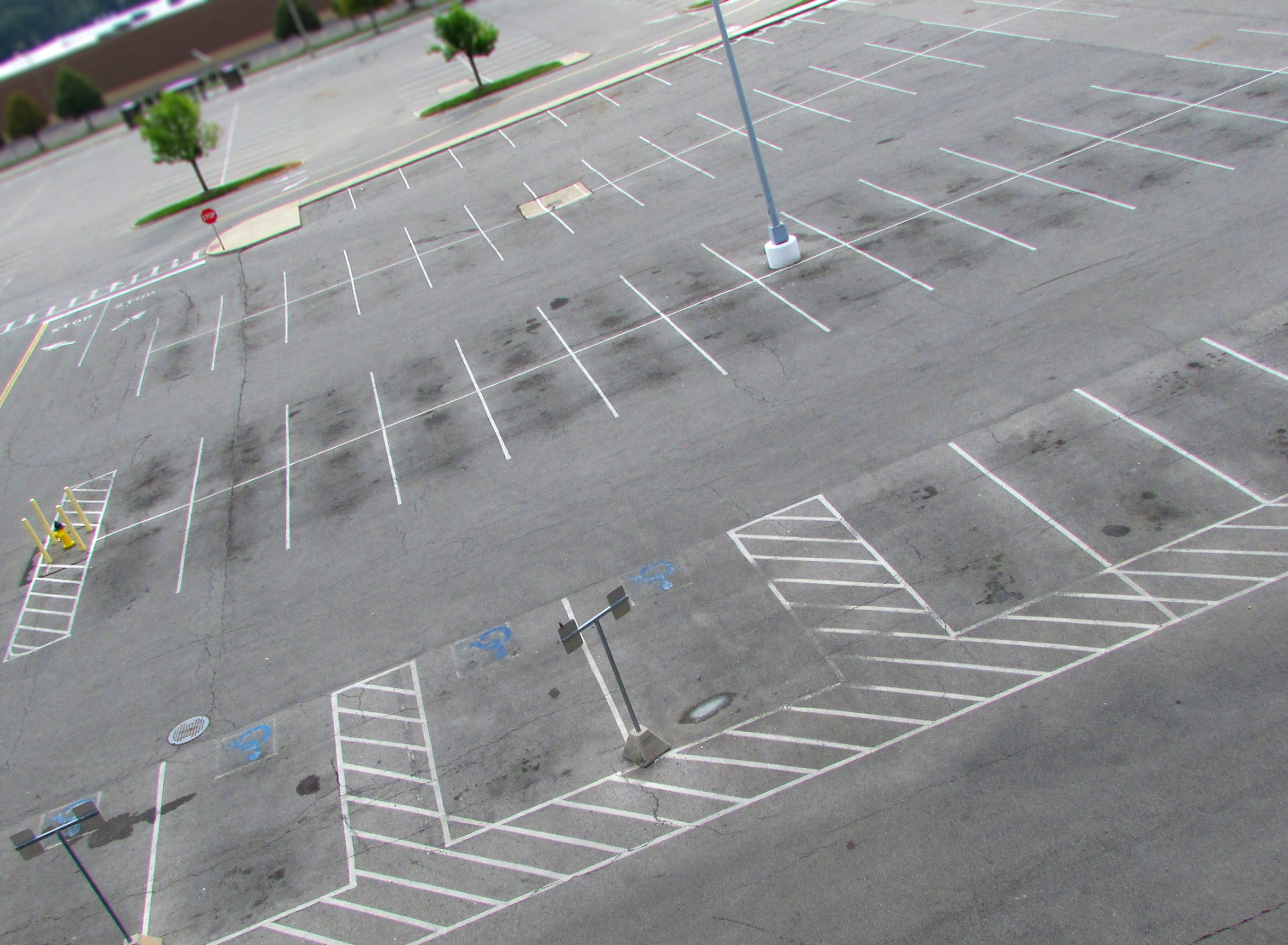 An extreme diagonal angled parking lot with a til shift effect applied and saturation turned up.