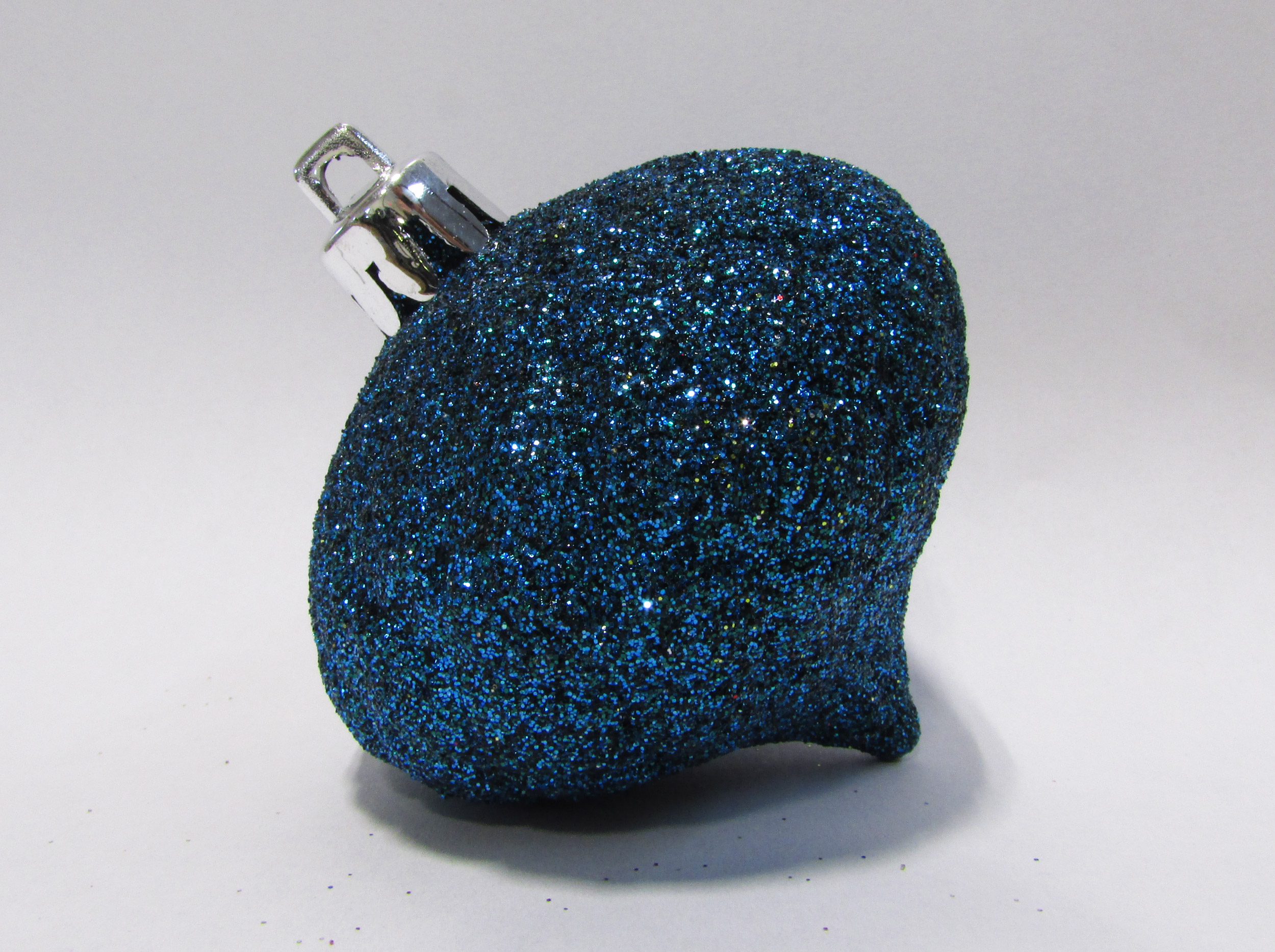 blue Christmas ornament that is covered in glitter rest on it's side in this picture. The surface and background are both white to make for easier incorporation into your design projects.