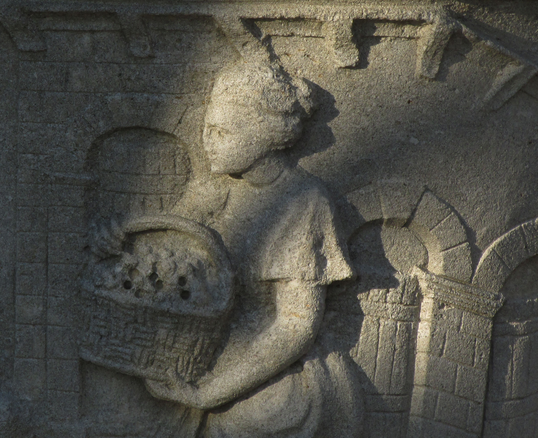An engraved image of a woman carrying a basket of [possible] produce on a large planter. The shadows that are cast from nearby trees gives interest to this picture.