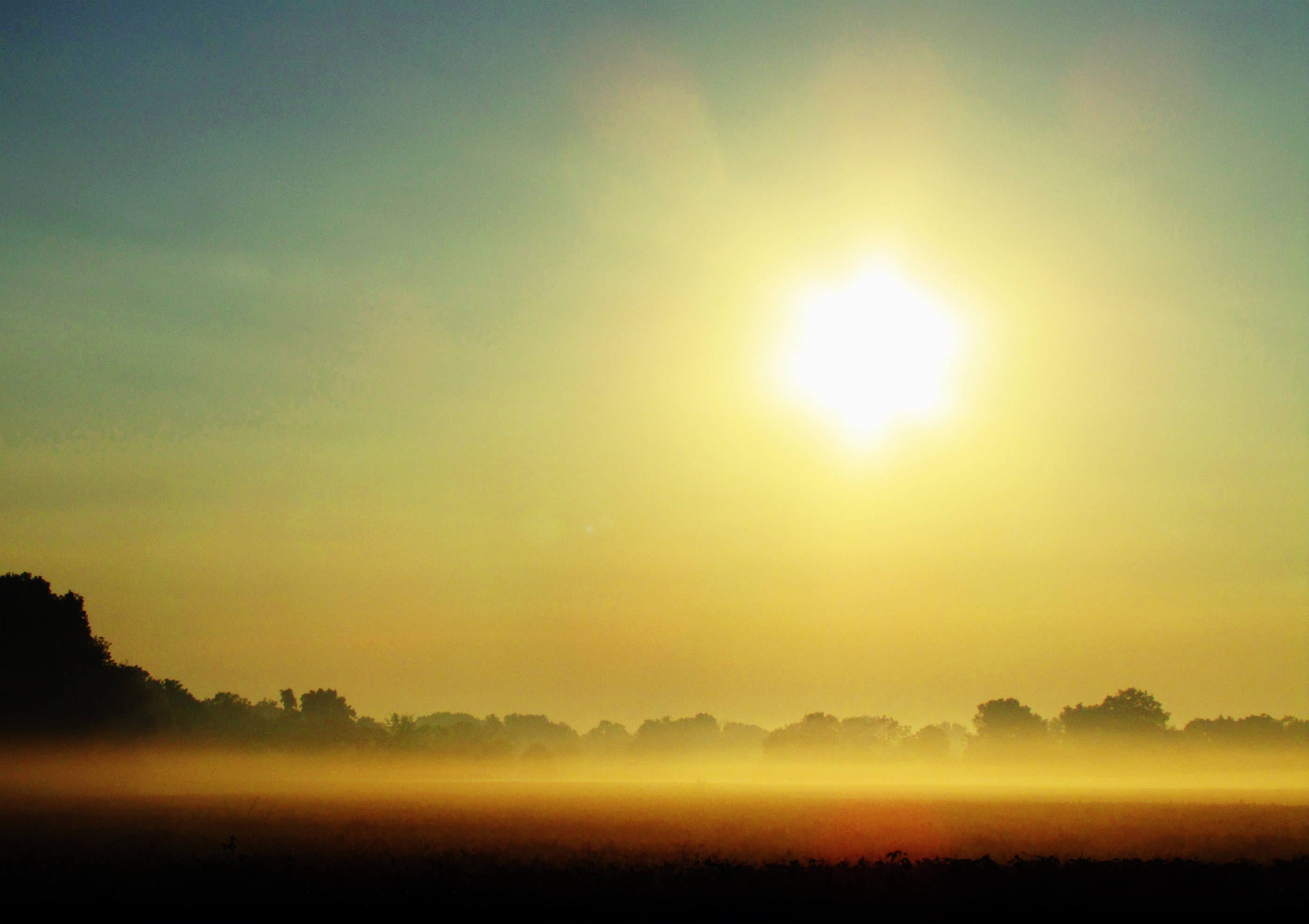 Sun rising over a field during morning fog in late fall.