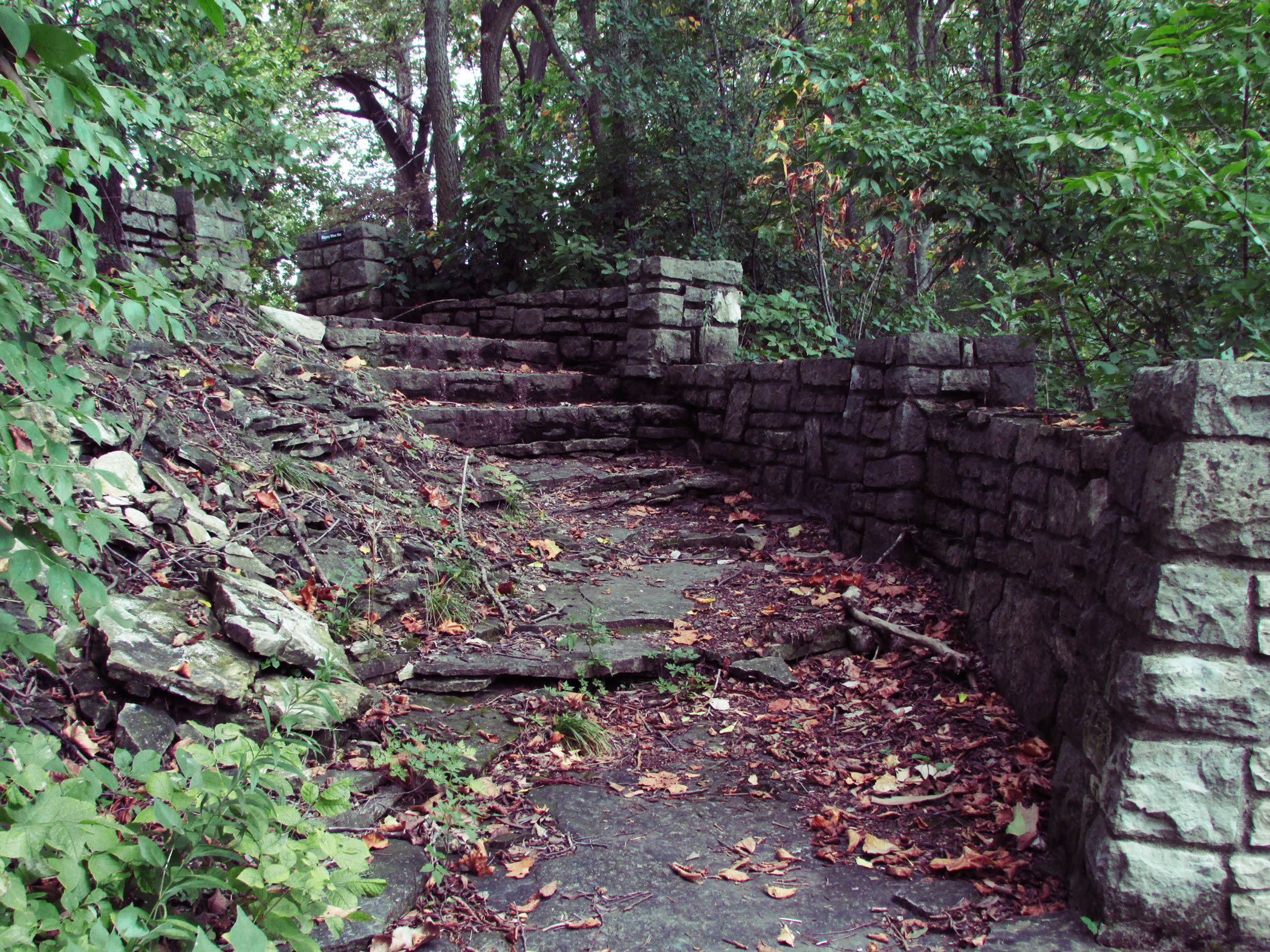Picture taken in early fall of stone steps leading up a path in a metro park.