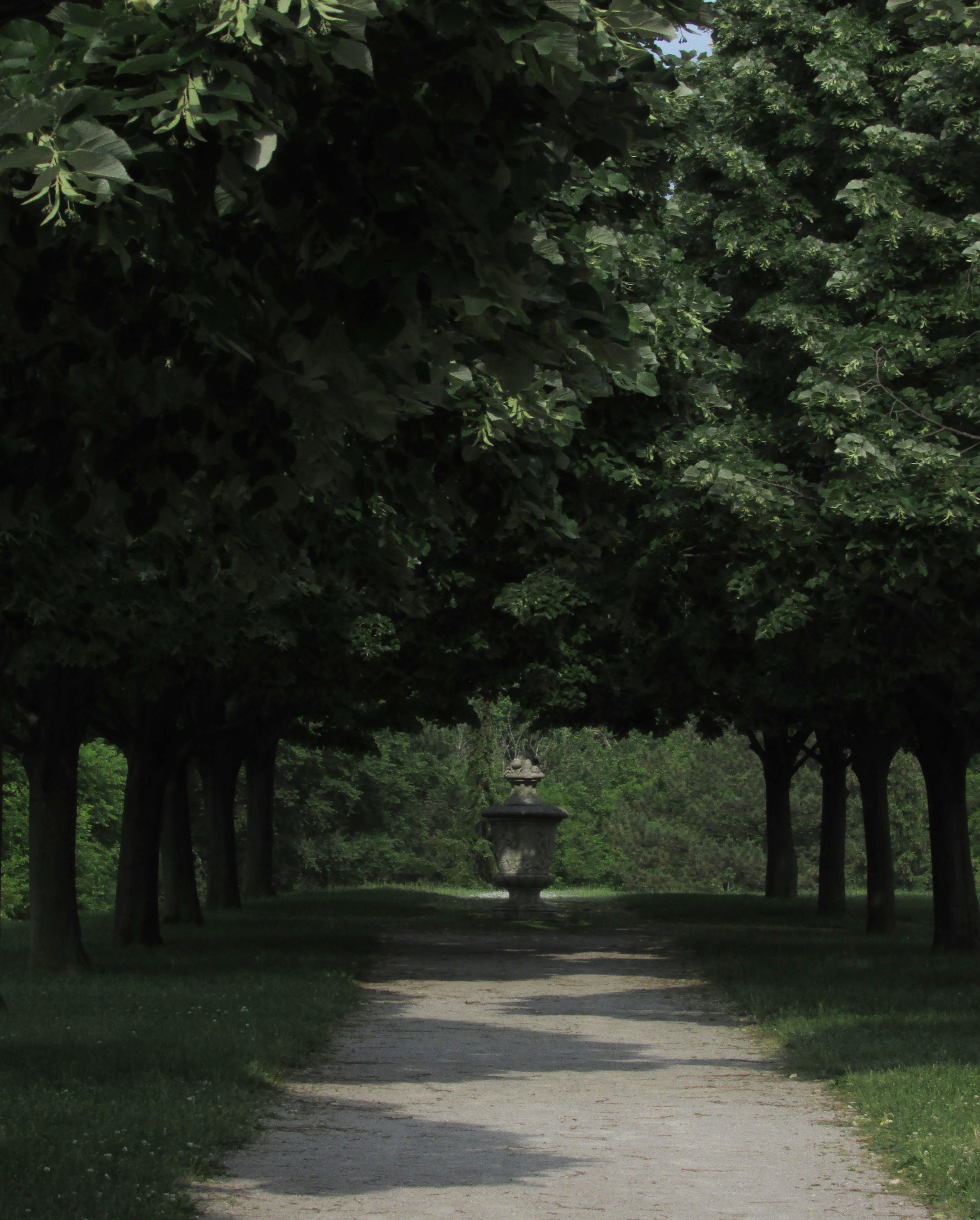 A stone and gravel path lead the way to a cement statue that sits in the middle. Trees are fully leafed out and casting shadows along the path.
