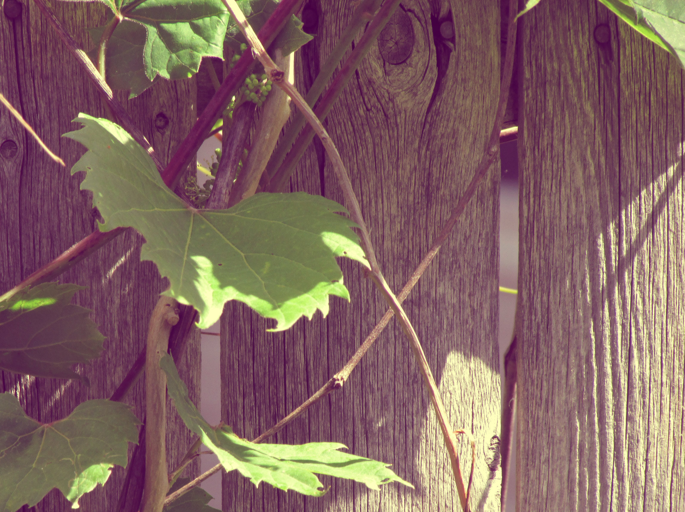 A picture of a wild grape vine growing on an old wooden fence. The colors have been muted to give a soft apperance and low contrast.