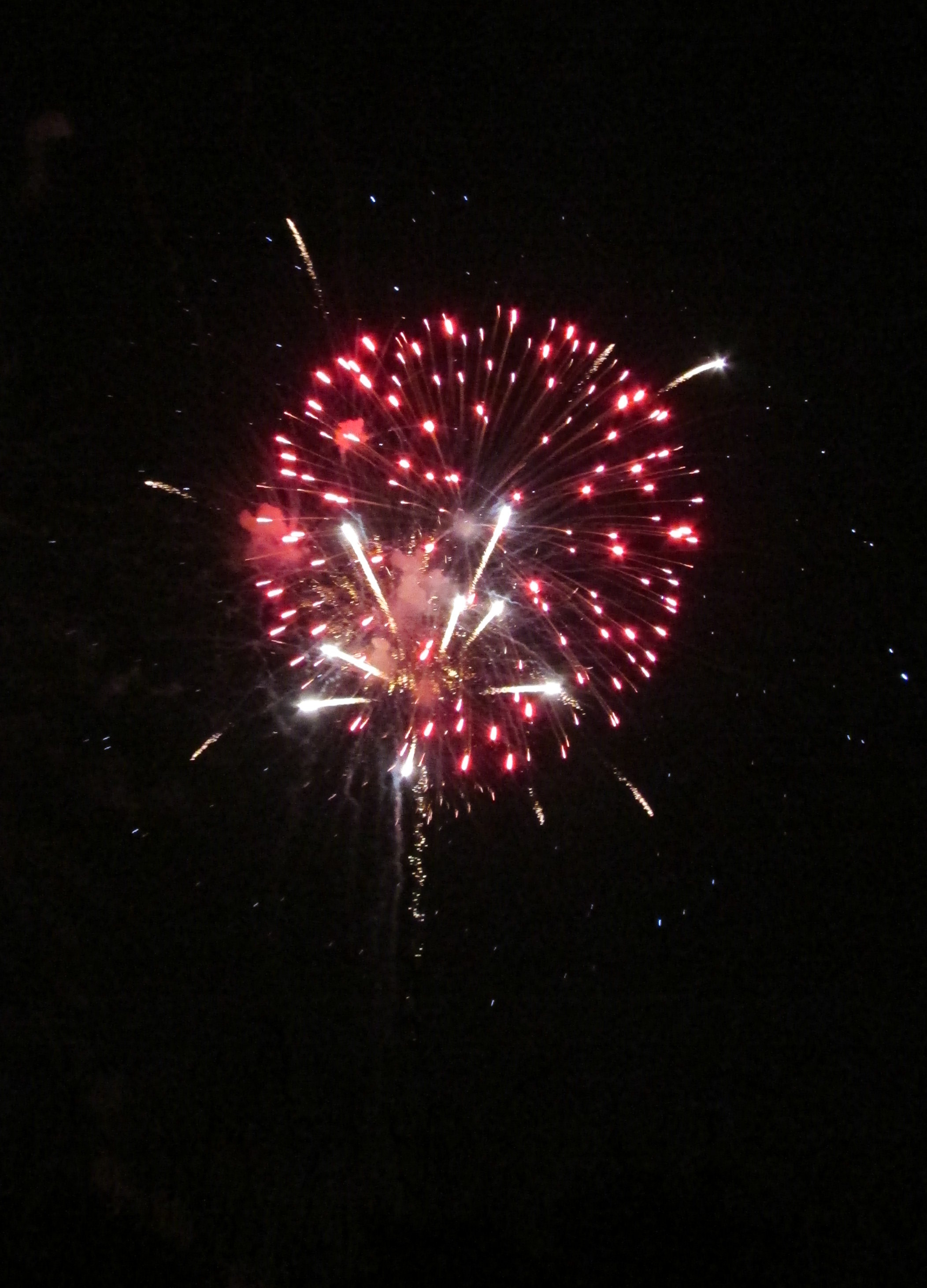 A burst of red and white in the evening sky! This picture was taken during the start of the fireworks during the 4th of July.
