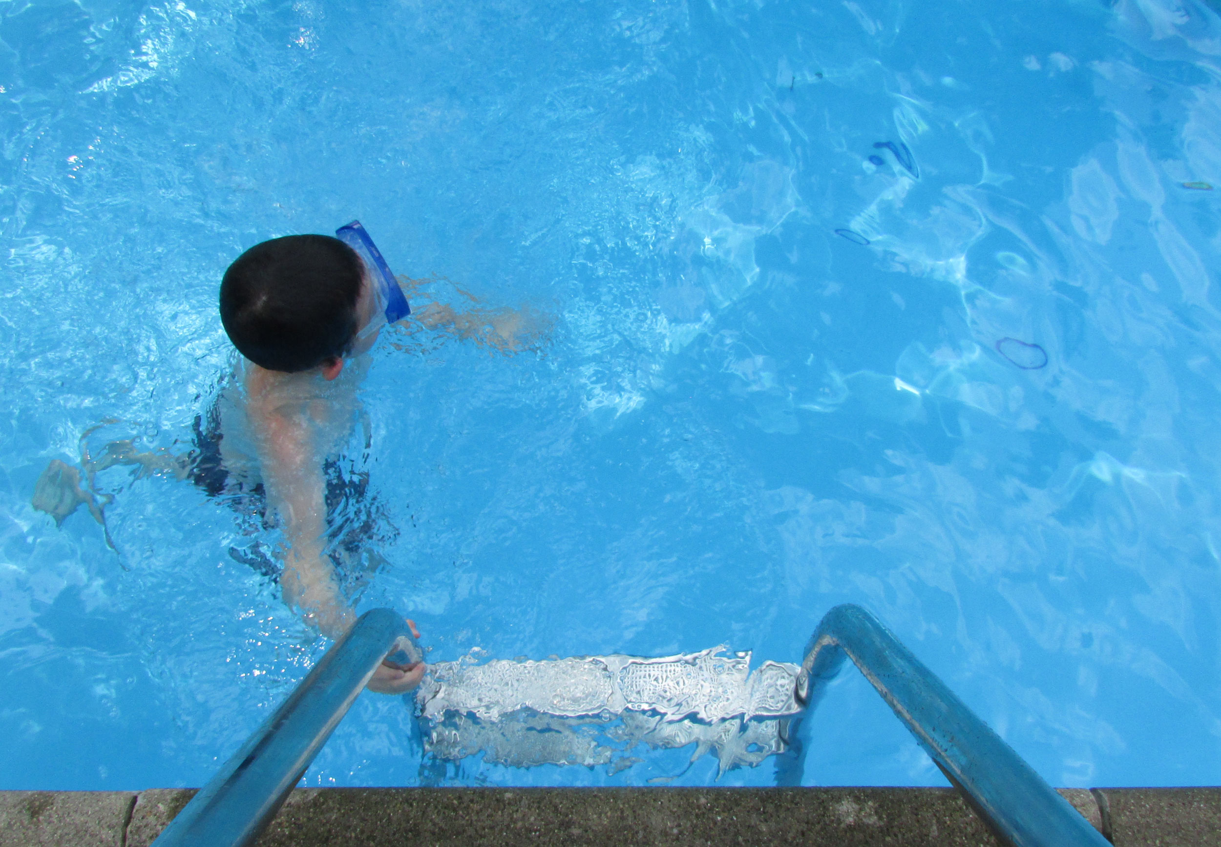 A picture taken from the top edge of a pool showing the ladder and a child swimming in the water.