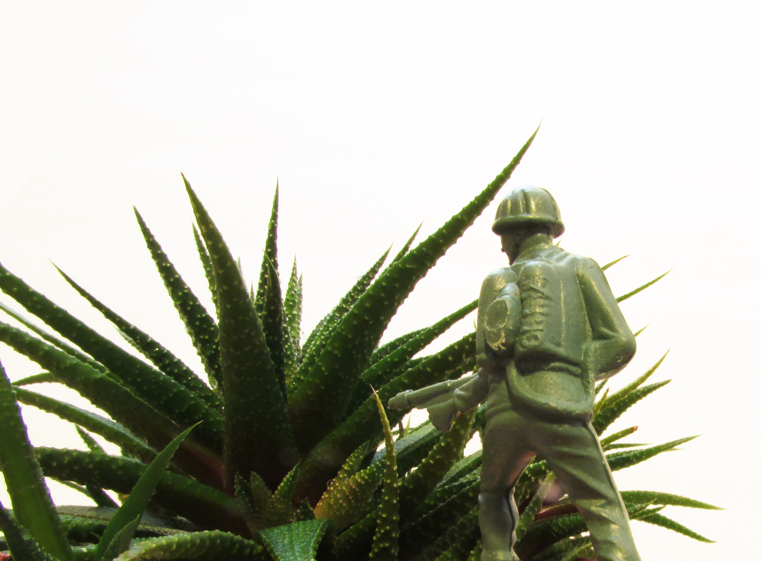 A picture behind a still life army soldier plastic toy piece approaching an aloe plant. The image is over exposed with a white background to give a sense of excitement and tension.