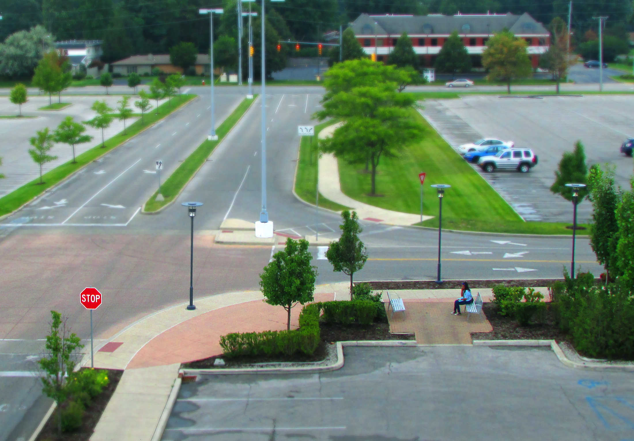 Another tilt shift image of that same parking lot. The saturation has been turned up- possibly too much - to give it the effect of a fake model scene.