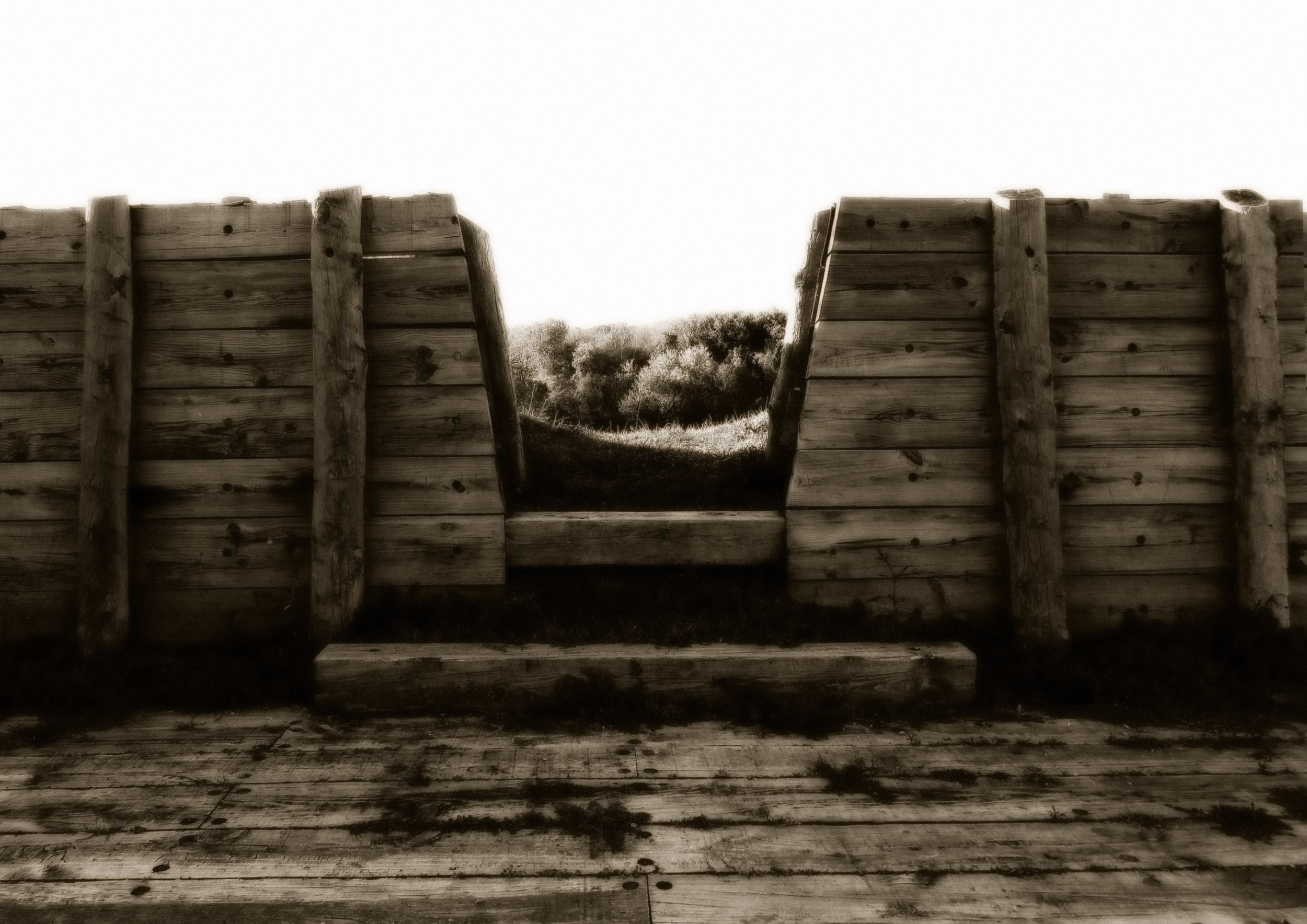 A picture of a platform with an opening where a cannon would be placed. This image has been modified using pixlr express to give it a vintage and old film impression.