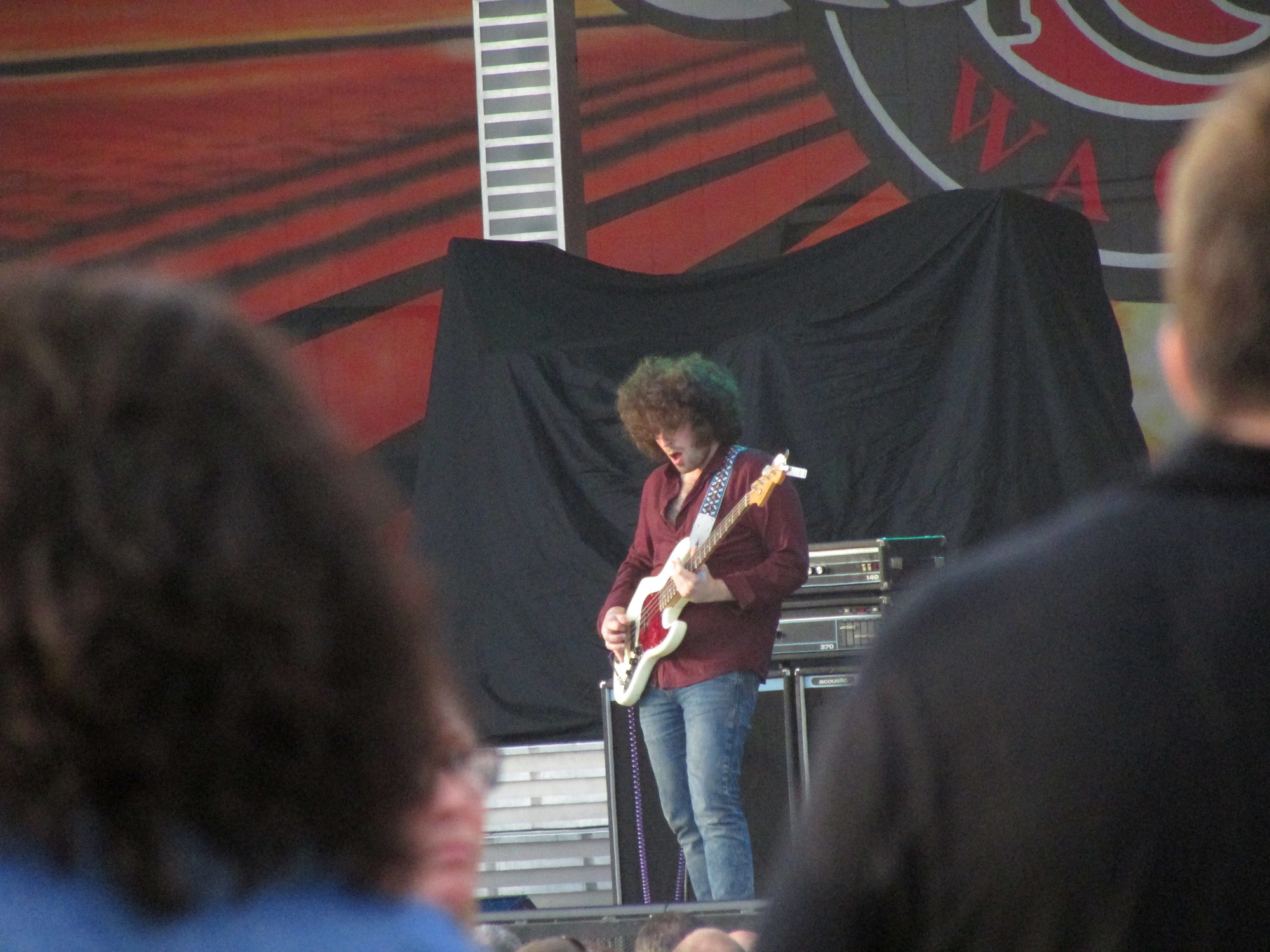 Stage with REO Speedwagon guitarist in focus and crowd of people in the foreground. Perfect summer event to watch a live concert outdoors.