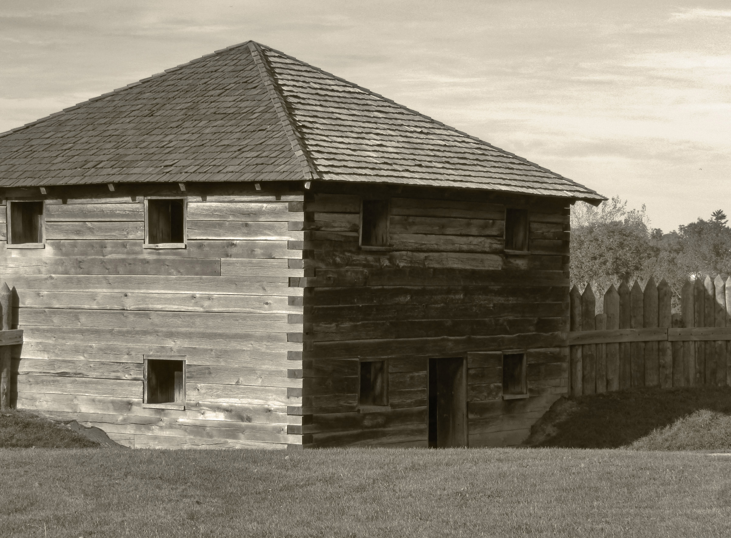 A reconstructed block house in a monochromatic color scheme. These homes sat on the interior along the wall of the fort used to fight the war of 1812.