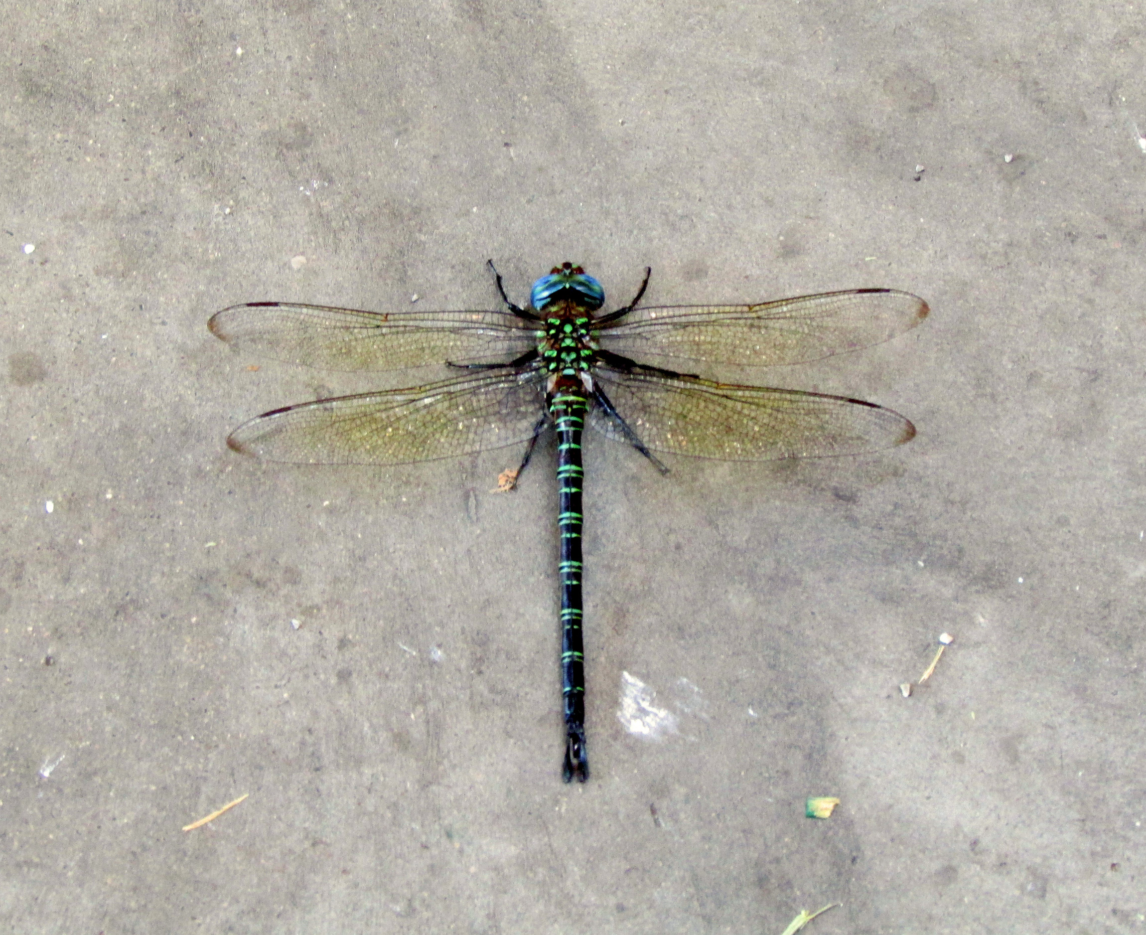 Picture of a blue eyed dragon fly with a variety of metallic colors on it's body and wings. It was about 6" long and resting on concrete floor when I found him.