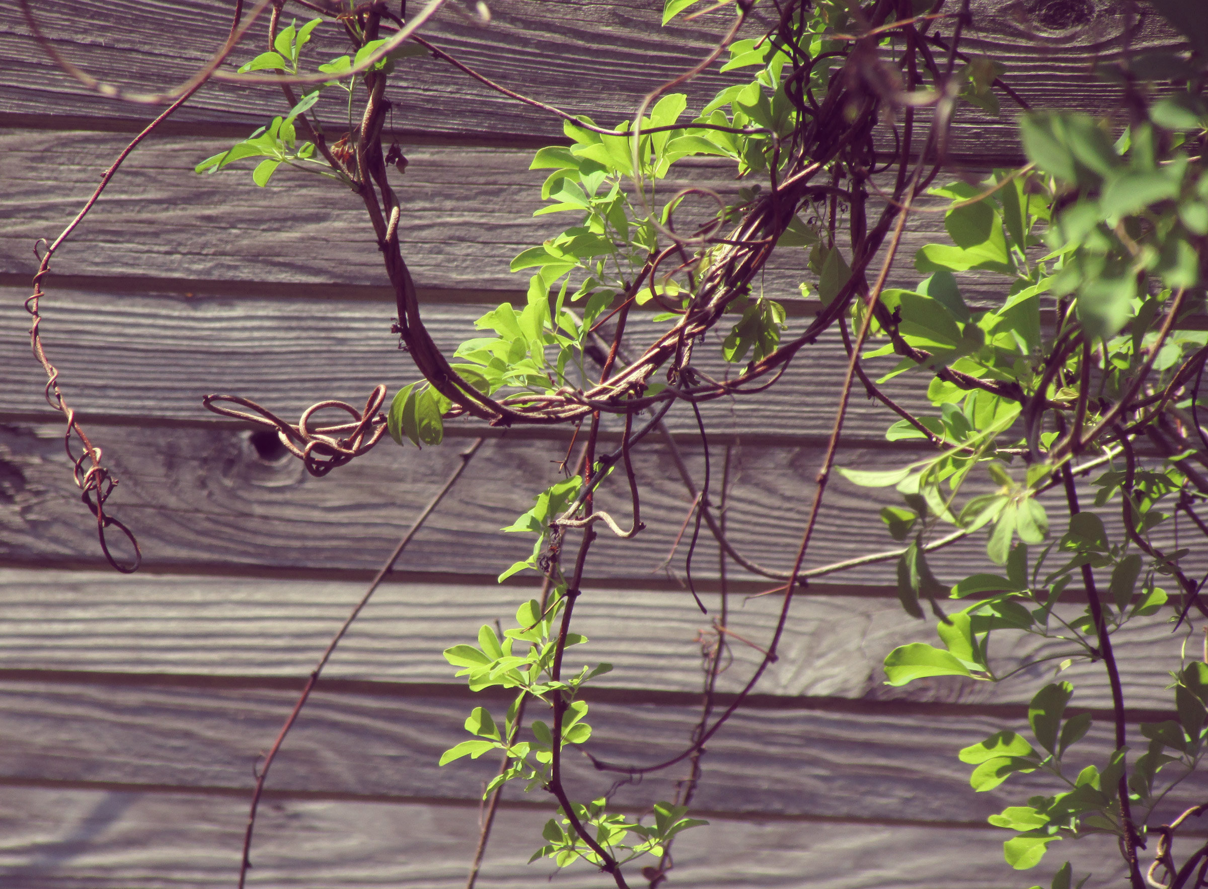 Vine draped on wood slit fence   Vines draped over a wooden slat fence with a filter added to mute the colors.