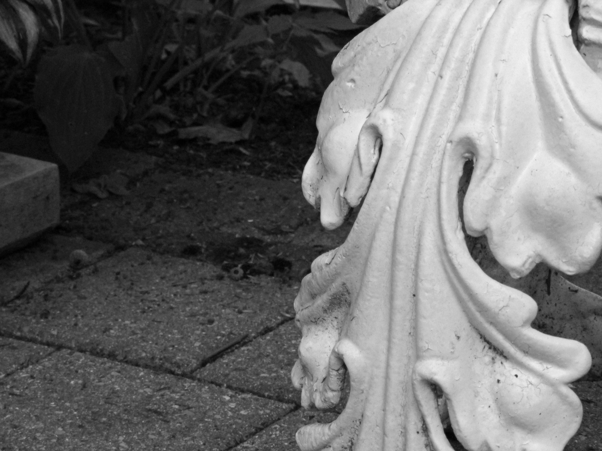 A black and white photo of a small patio . The close up shows the leg of the chair and stone pavers.