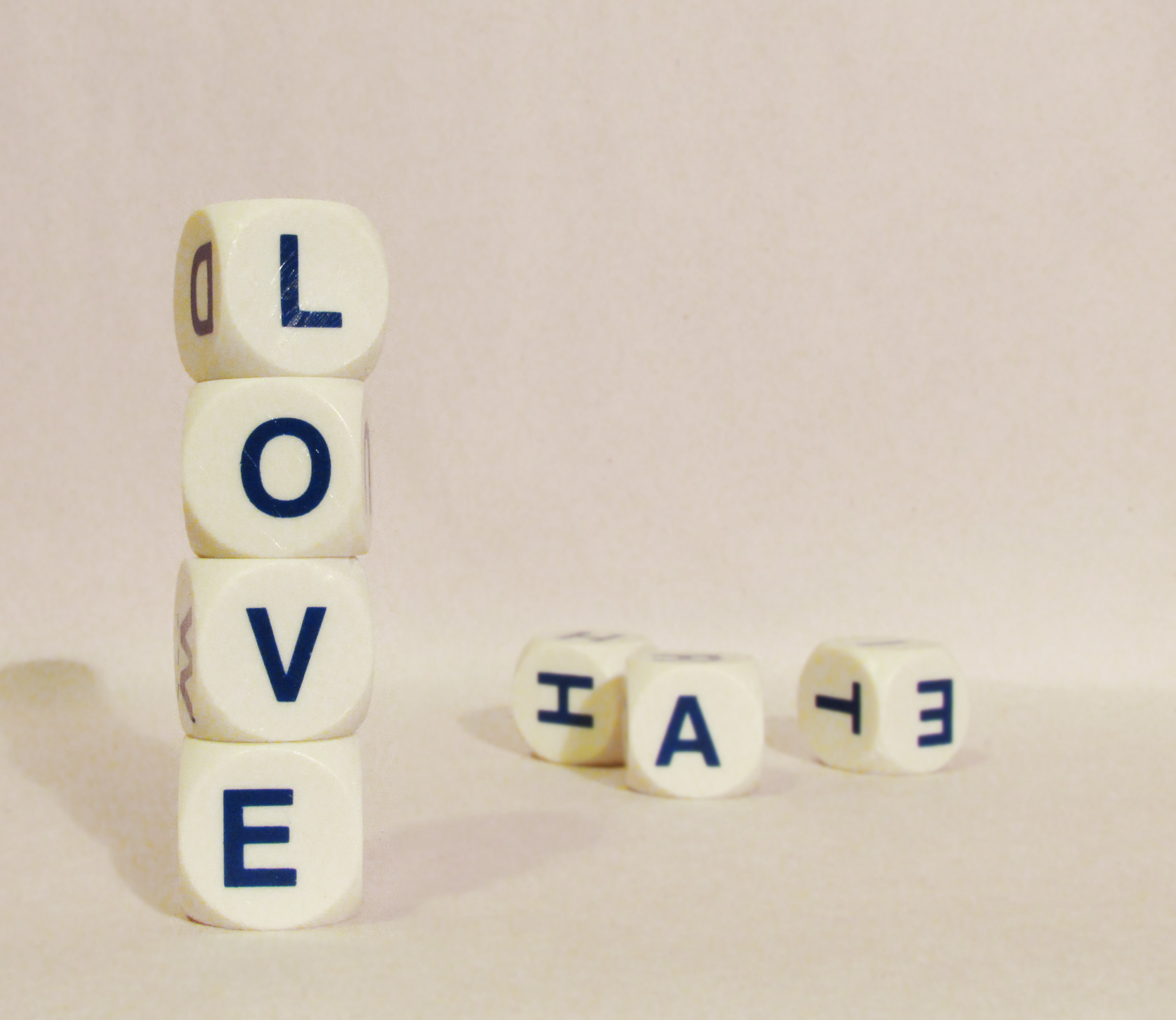 Letter cubes stacked and dropped to spell 'love' and 'hate'.