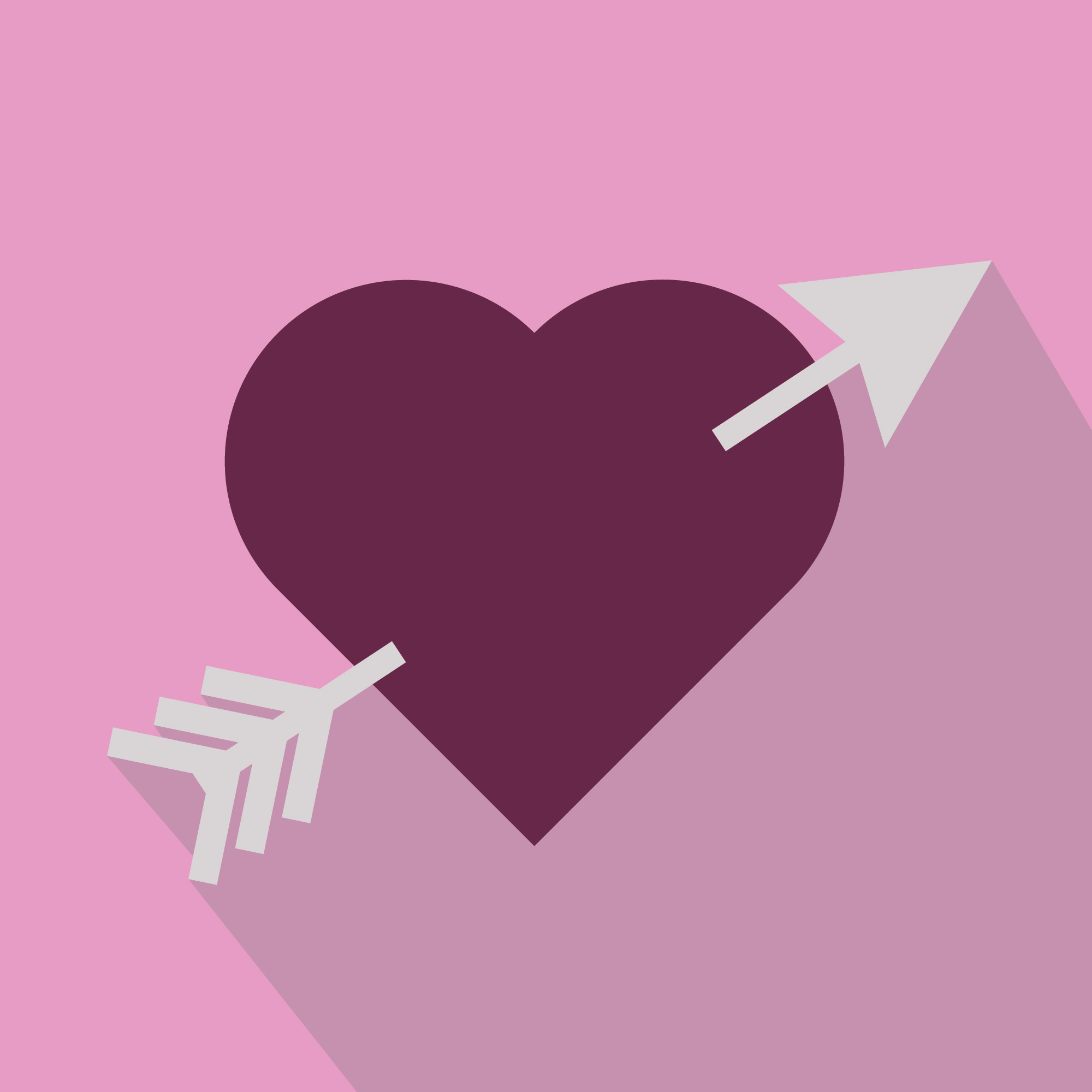 A flat design out of a rich red grape colored heart with an arrow piercing it. A shadow falls behind the main image.