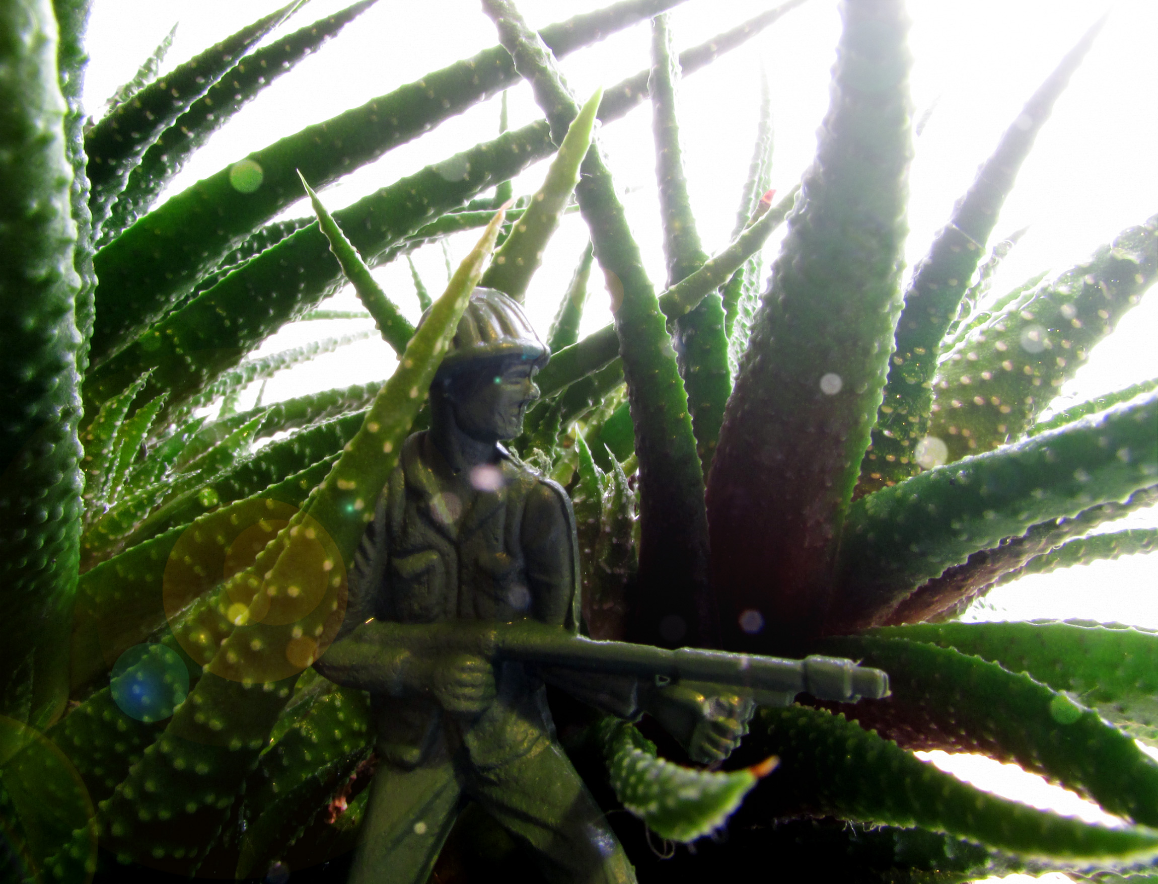 image of a plastic army man hiding in an aloe plant with over exposed white lighting and a lens flare effect from the light source.