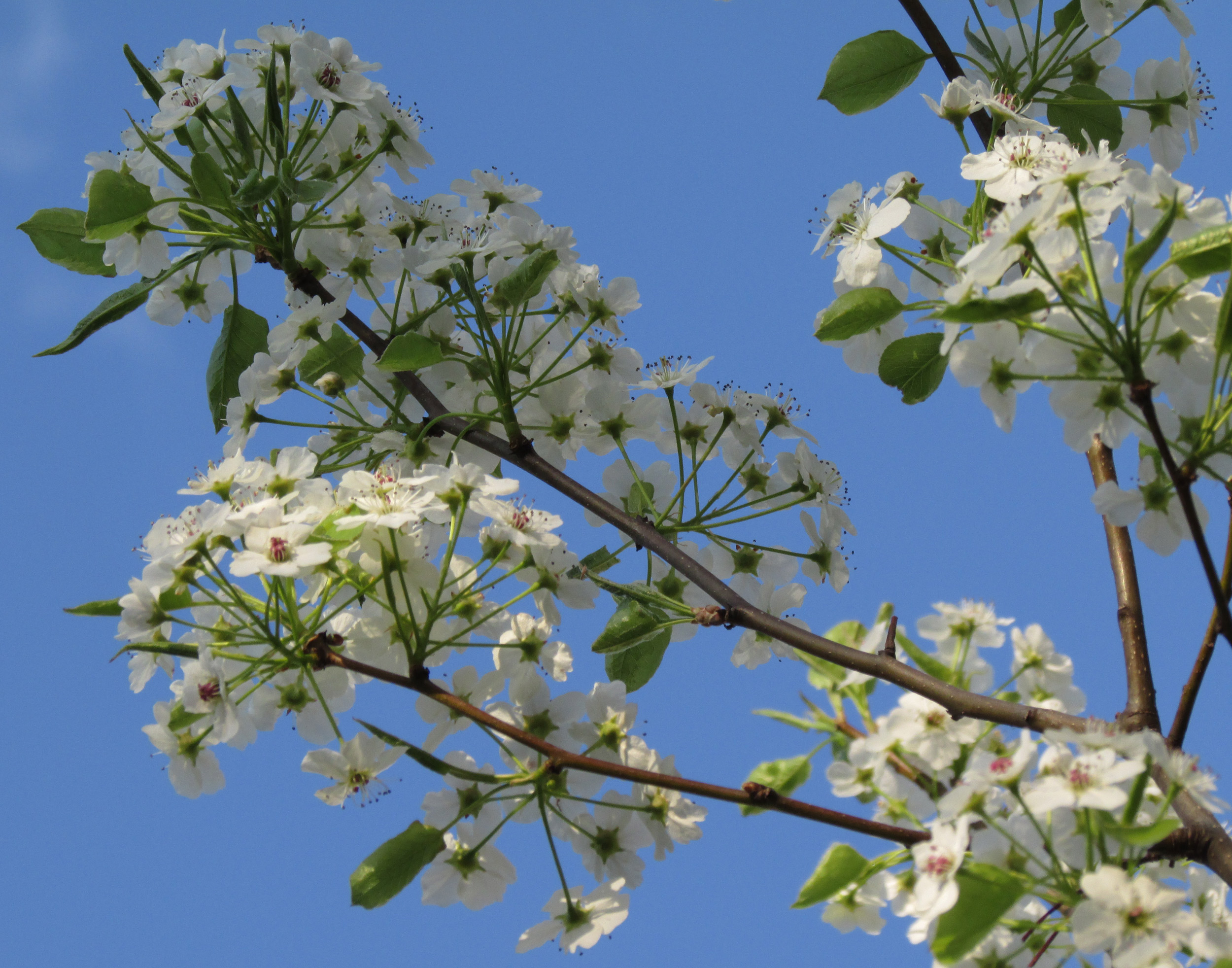 Picture of a Cleveland pear in full bloom during late spring. The flowers are white.