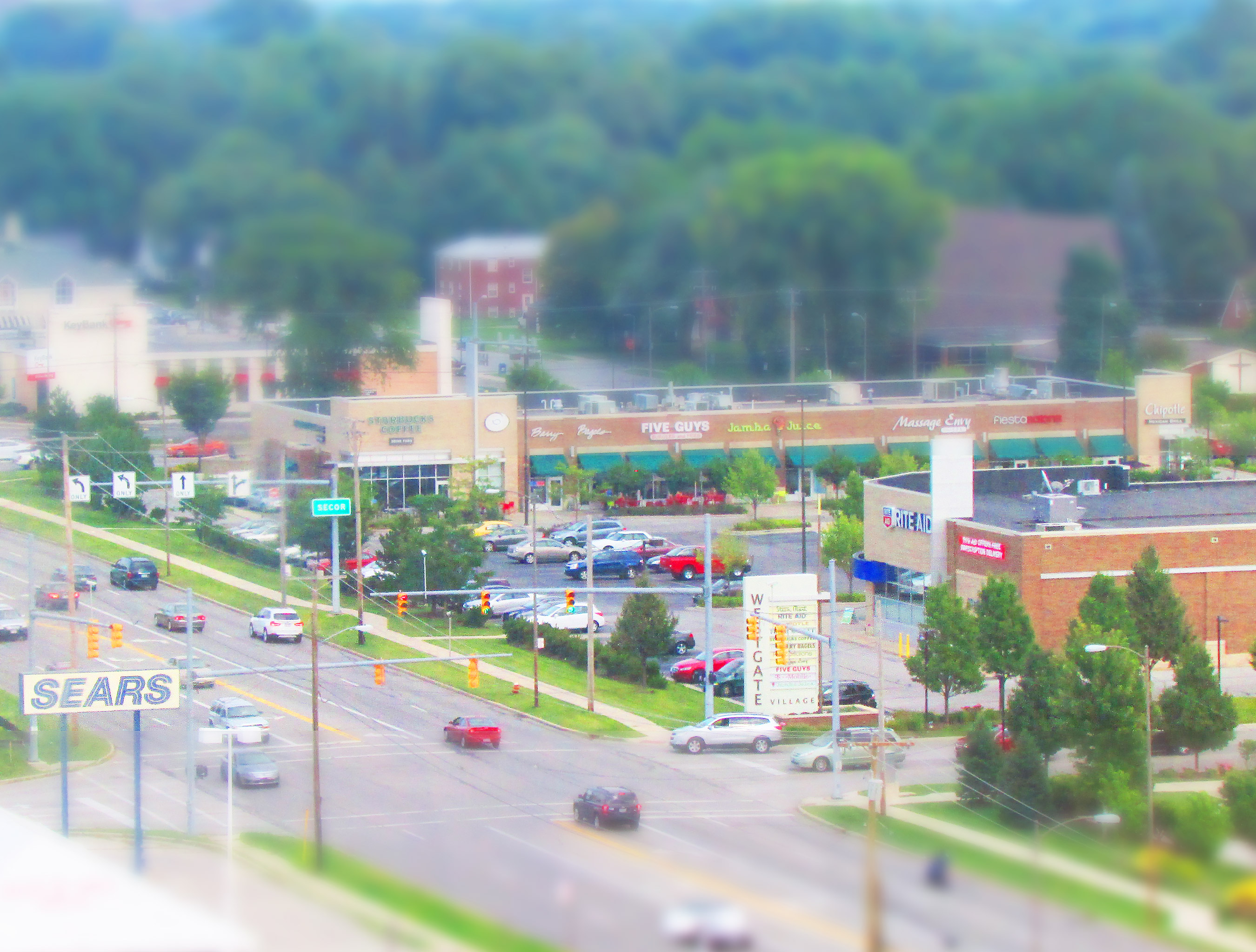 Another tilt shift image of that same parking lot. The saturation has been turned up- possibly too much - to give it the effect of a fake model scene.