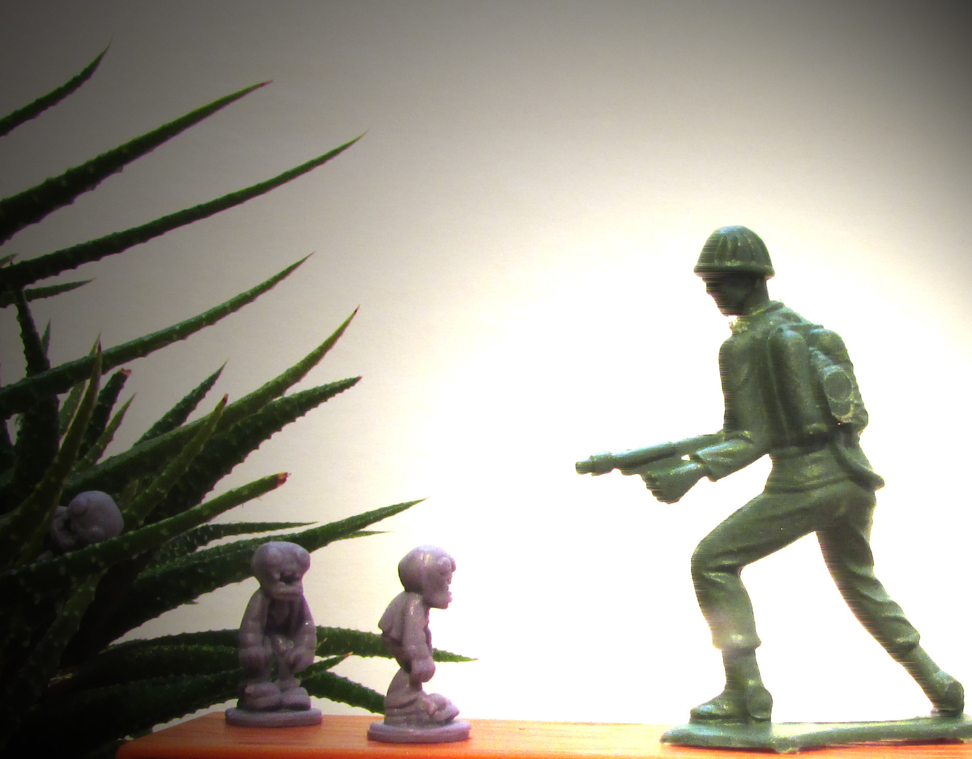 image of a plastic army man hiding in an aloe plant with over exposed white lighting and a lens flare effect from the light source.