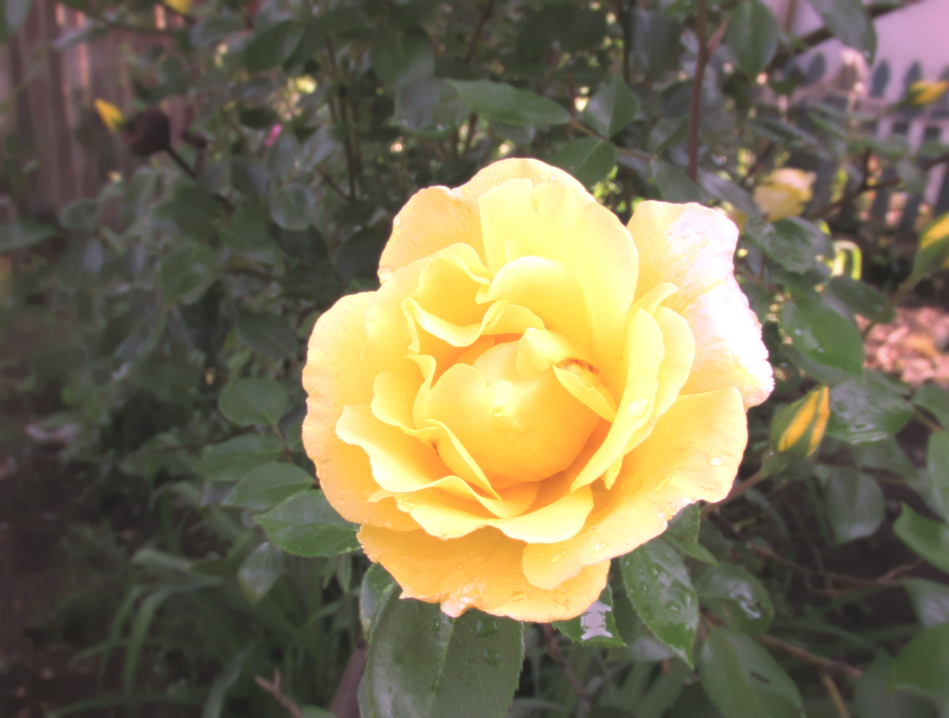 A photo of an american yellow finch at the park. He is perched on top of an iron works facing the sun.