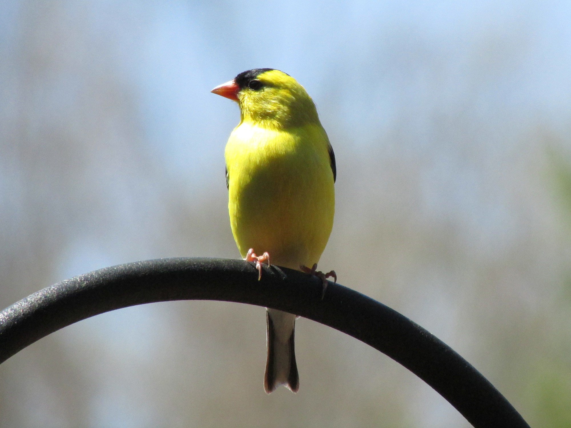 A photo of an american yellow finch at the park. He is perched on top of an iron works facing the sun.